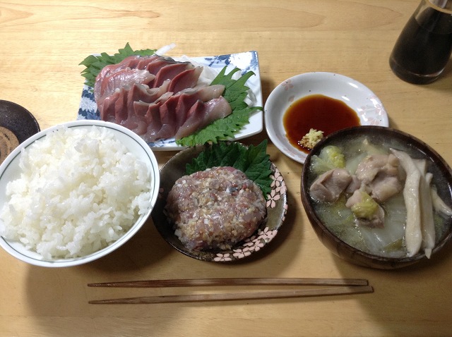 131128 フクラギの刺身とタタキ 魚を食べること 2013年11月29日 本日の夕食はフクラギです。ブリの幼魚でございます。 地域によって呼び方は違いますが、東北~北海道ではフクラギです。関東だとたしかワラサ。おおいにデップリとしたフクラギで御座いましたので、やや高値でしたが買ってしまいました。 いやにデブだなぁと思っておりましたら案の定、胃袋から小ぶりなイワシが2尾、口の中からイカが出てきました (ややグロ注意) 。漁の際の撒き餌かなにかでしょうか。胃袋パンパンでござんした。 というわけでいつもどおり、半身を刺身に。 フクラギは幼魚のため脂がそこまで乗っておらず、正直刺身には向きません。あっさりとした味で臭みもなく、ブリ類特有の酸味もそこまで強くありません。まぁそこそこ旨い。 んで、フクラギと行ったら個人的にはこれ、タタキです。なめろうといったほうが通じる人も多いかな?味噌と薬味とで細切れに練り込む漁師の料理です。いや、フクラギは刺身よりこれです。青魚全般タタキは旨いんですが、アジやサンマはそれ自体が十分旨いので、タタキにすると本来の味を殺してしまうかな?と思ってしまうところ。一方のフクラギはタタキにすることで味噌・薬味・フクラギの身がそれぞれの味を引き立て合い、なんとも言えないハーモニーを奏でるわけです。美味しいです。 ちなみに刺身+タタキで半身分です。ボリューム十分。 全景でこんなかんじです。汁物は柚子胡椒で下味をつけた鶏肉を、白菜とエリンギで味噌汁にしました。贅沢! 本日の予算は ・ご飯一膳 ・・・ 50円 ・フクラギ半身 ・・・ 200円 ・汁物 ・・・ 50円くらい? ・青じそ ・・・ 35円 計335円 残った半身と頭は、明日焼き物と汁物にします。ではでは。 PR